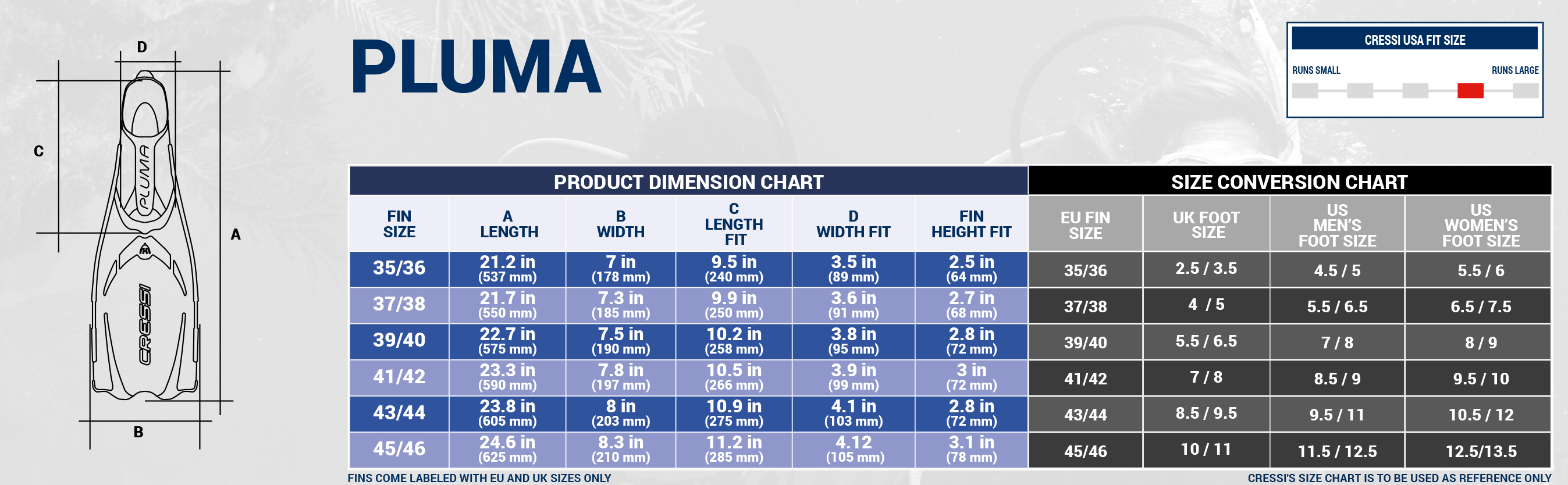 Cressi Pluma Full Foot Fins - Black or Blue - Blue - 45-46 (10-11). The Cressi Pluma is an extraordinary full foot fin that makes the most of a sophisticated moulding technology previously used only on the hi-tech models designed specifically for free diving and scuba diving. The Cressi Pluma is our best selling full foot fin for snorkelling. We highly recommend it.